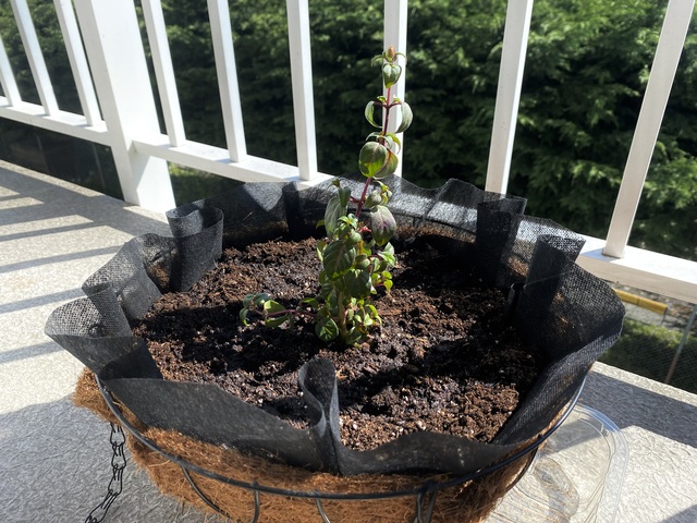 ハンギングバスケットは小ぶりのサイズしかストックがありませんが、まあ良しとしましょう。あらかじめ苗のポットも配置して土を入れます。またしてもライナーがないので園芸用不織布で代用です。今年は代用の嵐です。