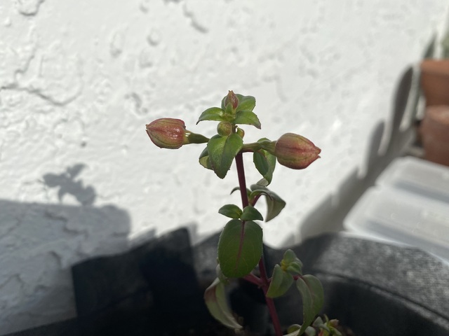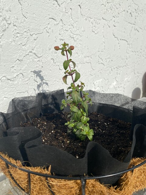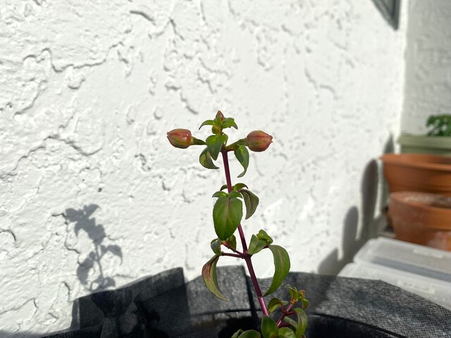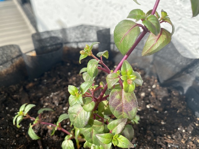 昨日に引き続いて観察日記です。4月25日に苗ポットからハンギングバスケットへ植え替えをしたフクシアが少しずつ育ってきました。一番上のつぼみが、大きくなってほんのり色付いてきました。